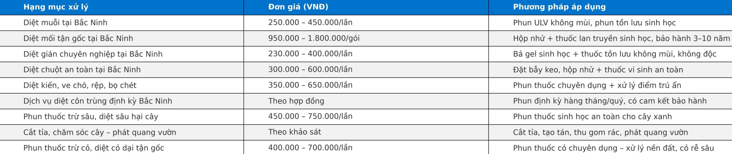 Nếu bạn đang tìm dịch vụ diệt côn trùng tại Bắc Ninh giá rẻ nhưng vẫn đảm bảo hiệu quả – an toàn, bảng giá dưới đây sẽ giúp bạn dễ dàng tham khảo và lựa chọn gói phù hợp: