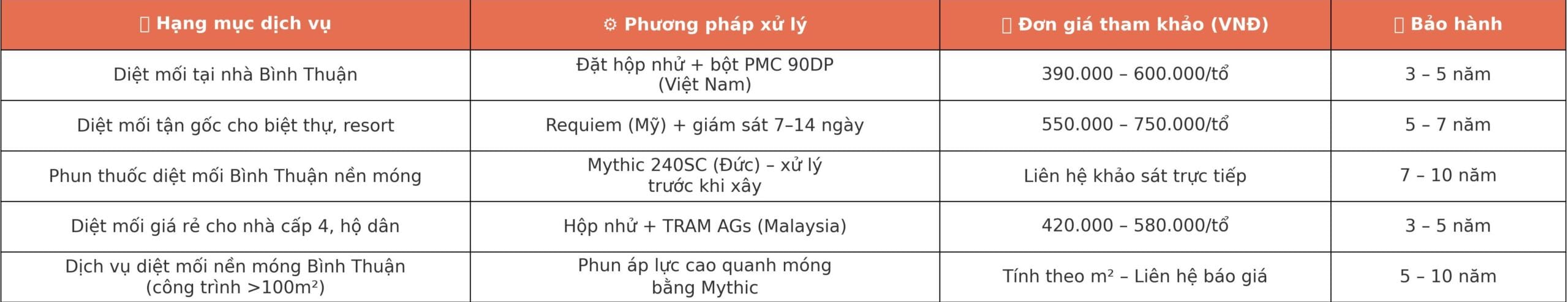 - 8 Bảng giá dịch vụ diệt mối tại Bình Thuận – Cập nhật mới nhất 2025