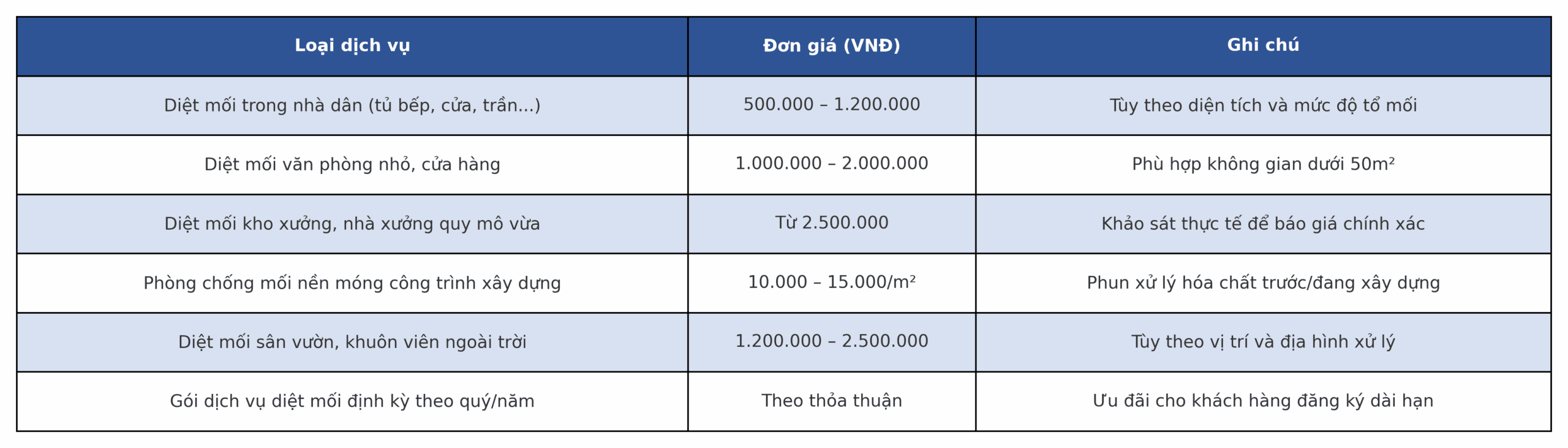 📌 Lưu ý: Mức giá trên chỉ mang tính tham khảo, có thể thay đổi tùy vào diện tích, mức độ mối và khu vực thi công.